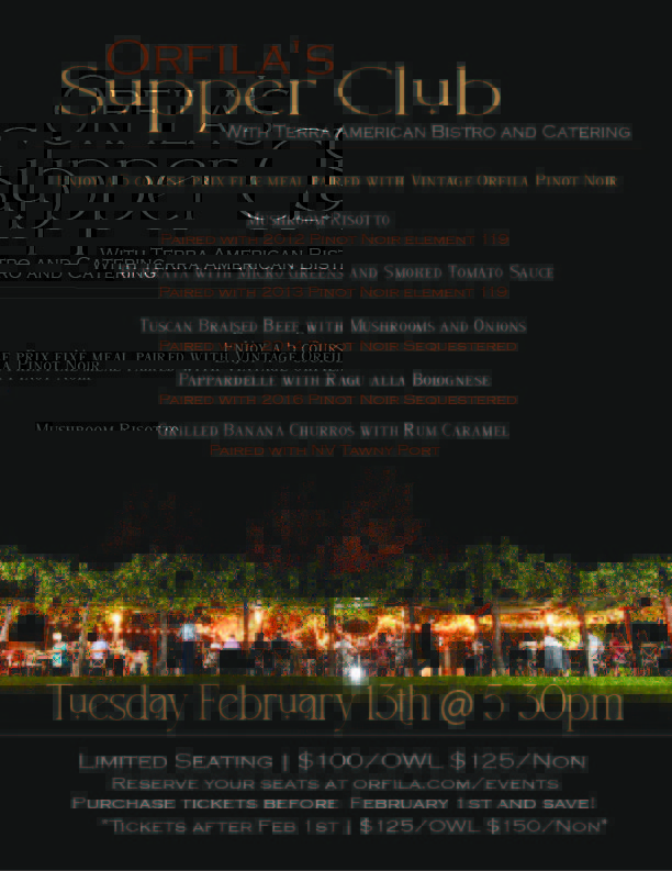Welcome to the Orfila Supper Club! Join us for a delightful evening of food, wine, and great company at the beautiful Orfila Vineyards and Winery. Indulge in a delicious gourmet meal paired with our exquisite wines, all while enjoying the stunning vineyard views. Immerse yourself in the cozy ambiance and let the flavors tantalize your taste buds. Whether you’re a wine enthusiast or simply looking for a memorable night out, the Orfila Supper Club promises an unforgettable experience. Don’t miss out on this extraordinary event! Seating is limited, so reserve today!